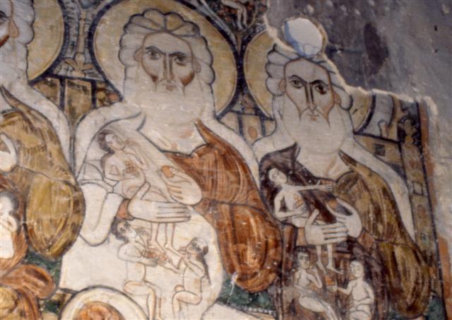 The picture displays a fresco from the Deir al-Surya monastry in Wadi al-Natroun in Egypt’s Western Desert from the 9th century. It shows the Patriarchs feeding the souls of the deceased in Paradise, allegedly with white grapes.