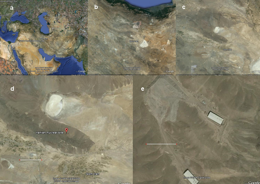 Fig. 1 Google Earth satellite imagery indicates (a) Iran; (b) Central Iran with the huge Daryacheh-ye Namak (the triangular white spot) and the smaller circular Daryacheh-ye Howz-e Soltan in the center of the image; (c) Daryacheh-ye Howz-e Soltan embedded in mountain ridges at the outskirts of Dasht-e Kavir, Iran’s Great Salt Desert; (d) the suspected new nuclear site (the bar corresponds to 10 km); (e) the site in 2005 (the bar corresponds to 100 m).