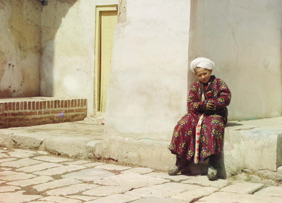 A boy in the court of Tillia-Kari mosque in Samarkand, ca. 1910. These pictures have breathtaking resolution and give an unreal impression due to their bright colors, other than, for example, rare original photographs of the 19th century in Vitaly Naumkin’s Bukhara (from the Caught in Time: Great Photographic Archives series).