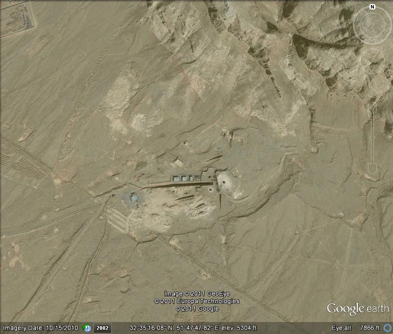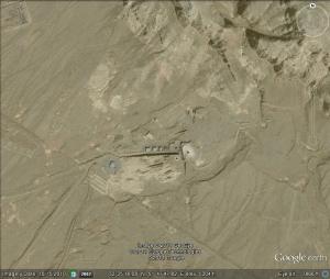 I have identified the site in Google Earth (October 15, 2010). It lies 2300 meters west to the UCF, at the southeastern foots of a hill or mountain. It measures 300 meters times 200 meters, about 0.06 square kilometers. There had been five buildings on the older images visible, and something what Albright interprets as “a ramp leading to a underground facility” (“It is unclear what Iran stored in this underground facility”). I had reported on the tunnel system of the UCF in a previous post, see here.