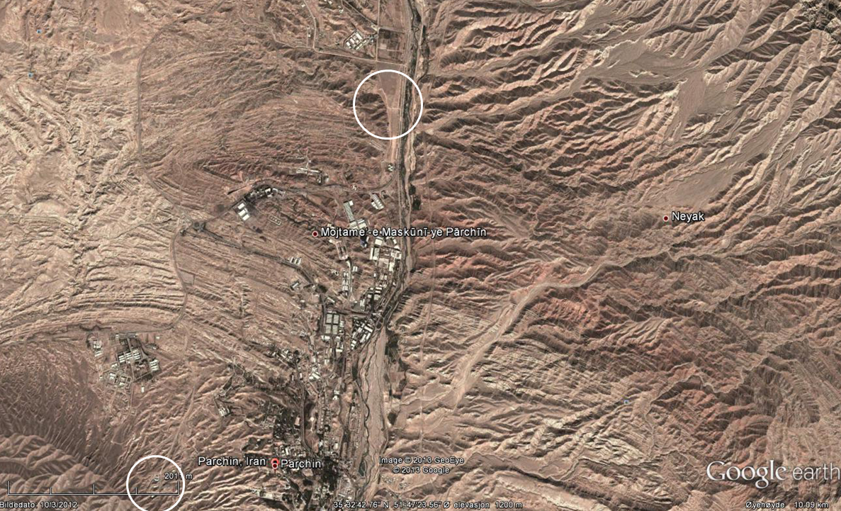 That conducting illict experiments with high explosives in a building (partly sealed off by an infamous berm) do not make too much sense was stressed yesterday by former IAEA director of nuclear inspections in Iraq, Robert Kelley. Tunnels would do better. There seems to be better locations at Parchin. Kelley exemplifies an area close to the main complex (encircled at the bottom of the satellite image), about 5 km southwest to the suspect building site (top).
