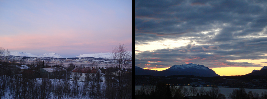 Tromsø is surrounded by several up to and more than one thousand meters high mountains, and when the full moon is close to the jagged horizon, in warmer colors due to borrowed sun light refraction in the denser atmosphere, the human eye perceives it huge. Much huger than when it is in the zenith in cold clear winter nights. It can easily be shown that the different size of the moon when it is close to the horizon or up in the sky is just an illusion, the moon illusion. The moon’s angular size is the same.