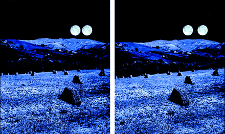 Stereogram of a landscape modified to include identical moons in each half-field. By fusion an impression is created that the left moon is closer and smaller than the right moon (Kaufman and Kaufman 2000)