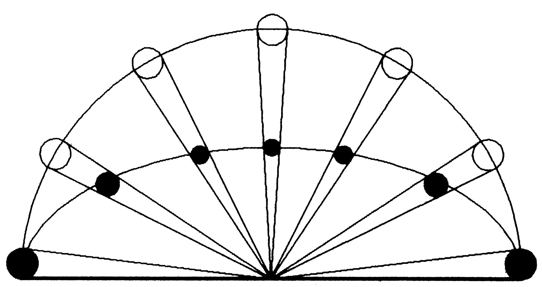 “What sight perceives regarding the difference in the size of the stars at different positions in the sky is one of the errors of sight. It is one of the constant and permanent errors because its cause is constant and permanent. The explanation of this is [as follows]: Sight perceives the surface of the heavens that faces the eye as flat, and thus fails to perceive its concavity and the equality of the distances [of points on it] from the eye …Now sight perceives those parts of the sky near the horizon to be farther away than parts near the middle of the sky; and there is no great discrepancy between the angles subtended at the eye-center by a given star from any region of the sky; and sight perceives the size of an object by comparing the angle subtended by the object at the eye-center to the distance of that object from the eye; therefore, it perceives the size of the star (or interval between two stars) at or near the horizon from comparing its angle to a large distance, and perceives the size of that star (or interval) at or near the middle of the sky from comparing its angle (which is equal or close to te former angle to a small distance.” [3]