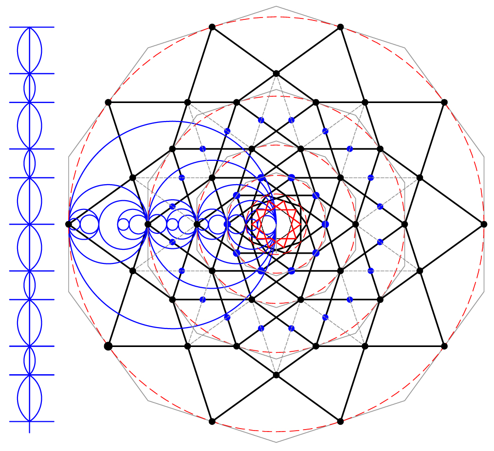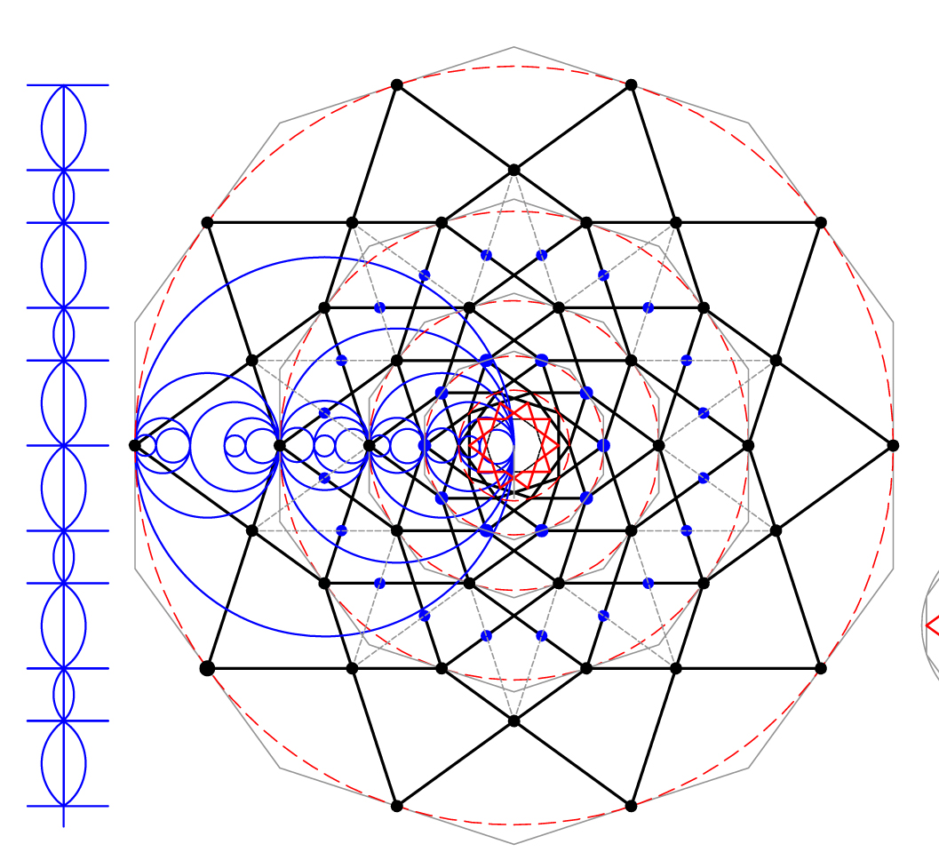 That construction of complicated, even quasi-periodic, tilings is in fact possible with compass and straightedge, even more than 900 years ago, has recently been shown by Rima A. al-Ajlouni (2012), see [pdf], an assistant professor at the College of Architecture of Texas Tech University, in Lubbock. A decagonal, quasi-periodic tiling (not exactly a Penrose tiling) which can be found at two different portals of the Darb-i Imam shrine and the Great Mosque in Esfahan (and, in essence, also on the somewhat disputed Gunbad-i Kabud in Maragha, Iran) is constructed from a framework of nested decagrams originating from a seed unit, a decagon. It grows based on the Fibonacci sequence and serves as the underlying basic grid for the quasi-periodic pattern. The positions of star units are entirely determined by the intersections of the network of nested decagrams. Connecting formations are formed by overlapping main units. The pattern can be grown infinitely by using the resulting cartwheel pattern as new seed unit.