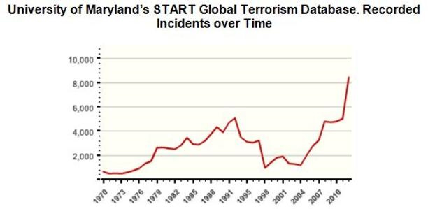 Let me offer you some data that I got from the University of Maryland’s START [National Consortium for the Study of Terrorism and Responses to Terrorism] program’s Global Terrorism Database [refers also to chart].