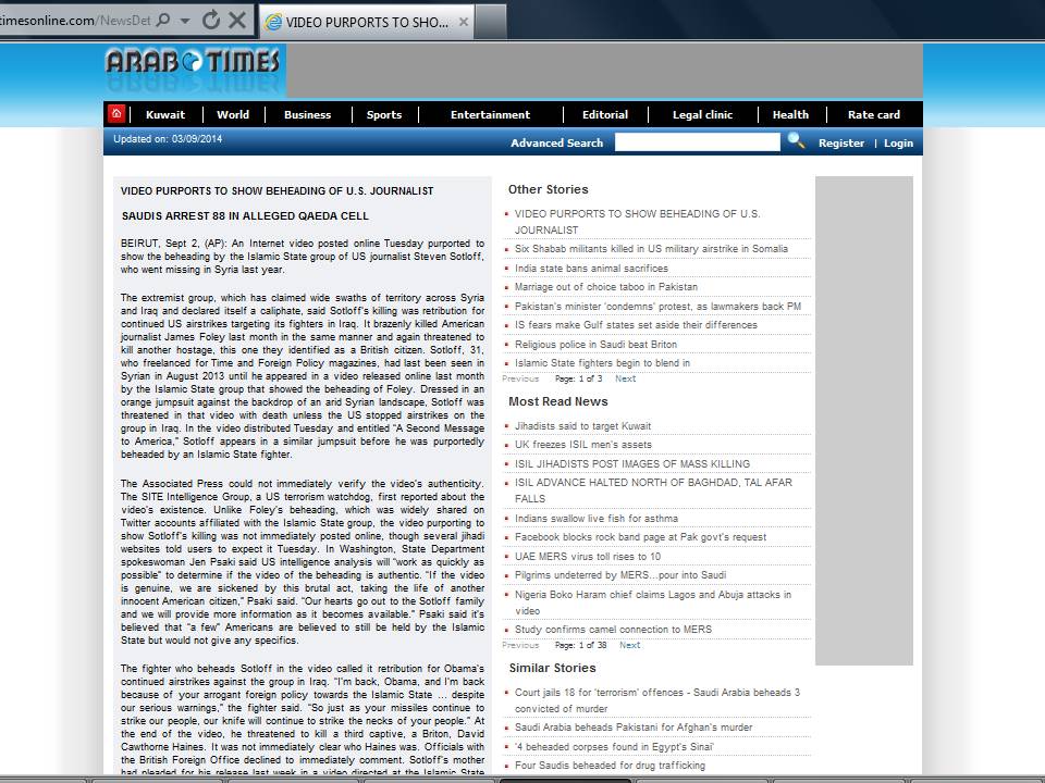 Having lived for couple of years in the Middle East, I wondered whether these beheadings were covered by Kuwaiti tabloid Arab Times. Well, they were. An AP note was repeated. No commentary, no comments (as usual, Kuwait has no free press or freedom of speech and if and when opinions in Arab Times are expressed names are usually “withheld”). 386 online viewers had read it. What is interesting is the list of “Similar Stories” in the column to the right. It is a massacre.