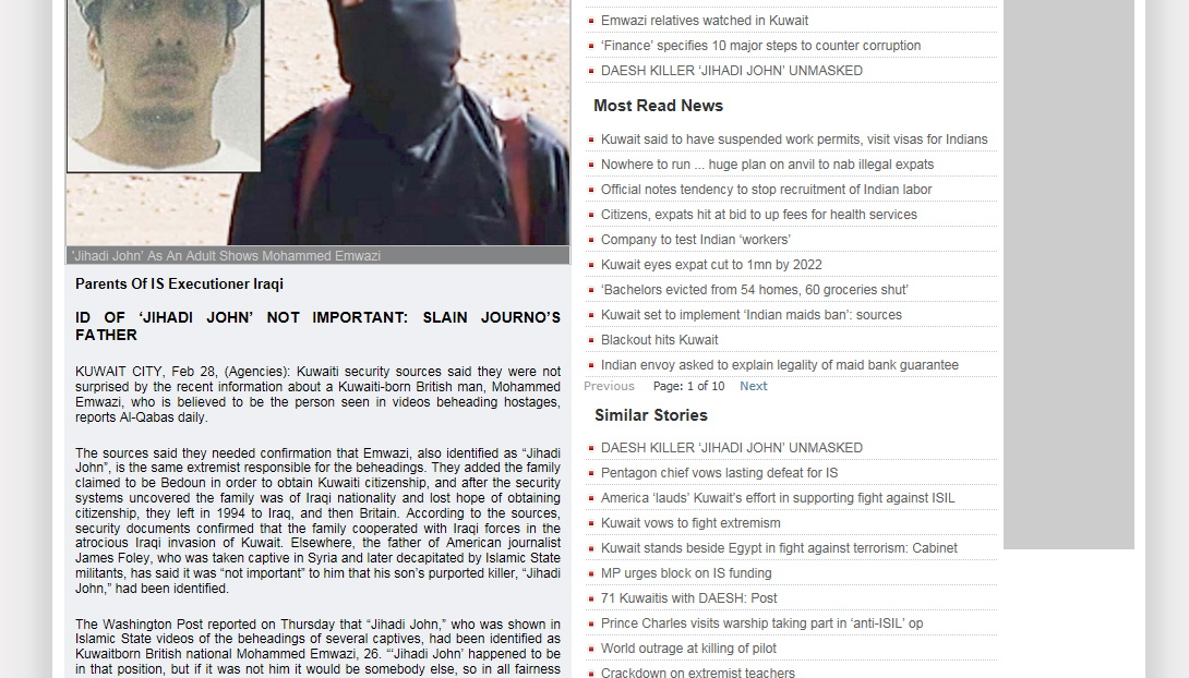 While the Guardian newspaper reports today that his former boss in an unnamed Kuwaiti IT company has praised Mohammed Emwazi’s skills and manners (“He was the best employee we ever had, … He was very good with people. Calm and decent. He came to our door and gave us his CV… How could someone as calm and quiet as him become like the man who we saw on the news? It’s just not logical that he could be this guy.”), Kuwaits English-language tabloid Arab Times still tries to conceal that the Kuwaiti born was living, at least for some time, in Kuwait. His parents (“Bedoun, stateless Kuwaitis, having joined Iraqis in Saddam’s onslaught on Kuwait in 1990“) are apparently surveyed and harrassed by authorities.