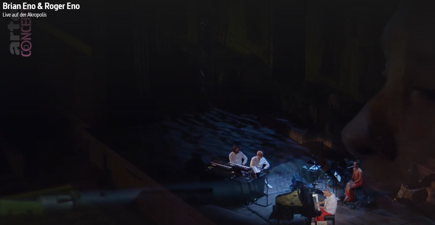 I am grateful that the French/German channel ARTE provides footage of the concert of Brian and Roger Eno at the Acropolis in Athens of August 4. The circumstances, in times of Covid, the most terrifying heat wave in Athens since 1987, and even more terrifying bush fires which had reached the outskirts of the Greek capital, must have been extraordinary. Peter Chilvers who was part of the, well, familiy band, wrote the next day, on the Manafonistas blog,
